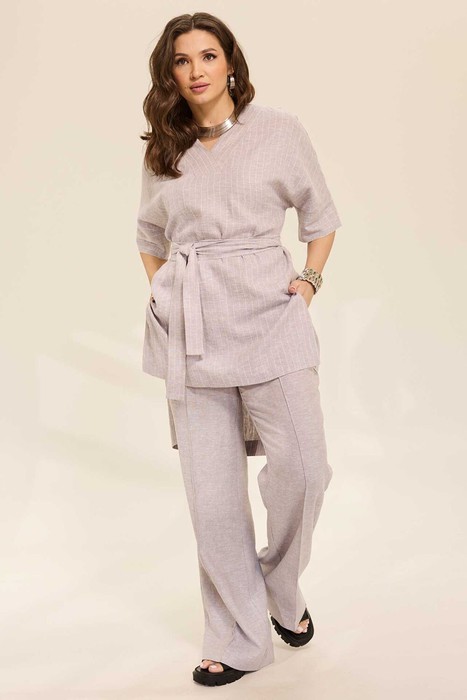 Костюм женский, состоящий из блузы и брюк. Блуза прямого силуэта, с разрезами по бокам. Ассиметричный низ: спинка длиннее переда. Рукав цельнокроеный, заканчивается притачной манжетой. Горловина V-образная с притачной планкой по линии переда, спинки и рукава. Головина на завязке. Дополнением служит пояс. Брюки по силуэту с легким клешем от колена, по передним половинкам по центру застрочен защип. Карманы боковые накладные. Брюки с застежкой на молнию. Притачной пояс застегивается на петлю-пуговицу и с резинками по бокам. Модель без подкладки.