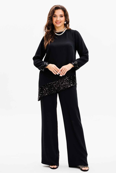 Костюм женский состоит из блузы и брюк. Блуза свободная, А-силуэта, рукав втачной. Спинка со средним швом, заканчивающимся на воздушную петлю-пуговицу. По низу изделия и низу рукава декоративные детали из пайеток. Брюки палаццо, на притачном поясе с резинкой и тесьмой. У брюк - боковые карманы.