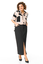 Костюм женский, состоящий из жилета и брюк. Жилет полуприлегающего силуэта, без подкладки. Плечо спущенное.Вырез V - образный, с воротником стойкой. По переду иммитация карманов с клапаном. Центральная застежка на пришивные кнопки.  Спинка со средним швом и вытачками. Брюки прямого силуэта, слегка зауженные к низу. Пояс частично на резинке (по бокам), с шлевками для ремня. Застежка на гульфик с молнией и пуговицей. По бокам карманы с косым входом. Материал костюма костюмный, средней плотности, с гладкой фактурой. Без подкладки. Дополняет модель широкий пояс.