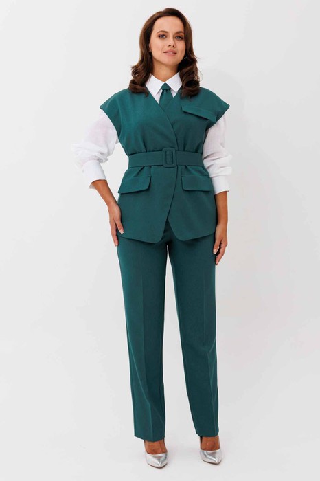 Комплект женский, состоящий из жилета и брюк. Жилет полуприлегающего силуэта, без подкладки. Плечо спущенное.Вырез V - образный, с воротником стойкой. По переду иммитация карманов с клапаном. Центральная застежка на пришивные кнопки. Спинка со средним швом и вытачками. Блуза женская, прямого силуэта с потайной застежкой. Перед с нагрудными вытачками. Спинка с отрезной кокеткой. Воротник рубашечного типа, с отрезной стойкой. Рукав тачной, одношовный, с манжетой по низу. Низ фигурный. Галстук на резинке. Брюки прямого силуэта, слегка зауженные к низу. Пояс частично на резинке (по бокам), с шлевками для ремня. Застежка на гульфик с молнией и пуговицей. По бокам карманы с косым входом. Материал костюма костюмный, средней плотности, с гладкой фактурой. Без подкладки. Дополняет модель широкий пояс.