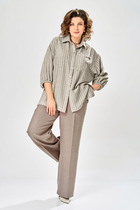 Элегантный женский костюм классического кроя. Комплект состоит из жакета и юбки-карандаш. Жакет полуприлегающего силуэта, спинка со средним швом. По конструкции предусмотрена центральная застежка на 8 пугович. воротник стоячий отложной. Рукава втачные, со сборкой по окату. Юбка длиной миди, слегка зауженная к низу со шлицей. Пояс юбки на обтачке, застежка на тесьму-молнию, пояс частично на резинке по бокам. Жакет и юбка на подкладке.