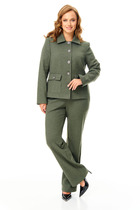 Жакет со спущенными плечами застёгивается на шесть прорезных петель и пуговиц. По переду прорезные карманы с широкой листочкой и накладные карманы с фигурными клапанами на застёжке. Воротник отложной. Рукава одно шовные втачные на манжете.