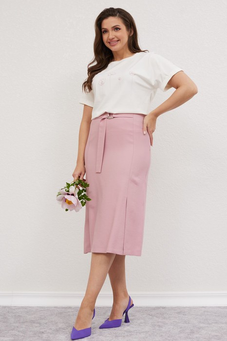 Юбка, слегка расклешённая к низу, на обтачке, без подкладки. По переду рельефы от талии до низа, заканчивающиеся шлицами с разрезом. По заднему полотнищу юбки талевые вытачки, центральный шов и застёжкой на потайную тесьму-молнию.