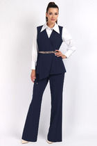 Комплект женский полуприлегающего силуэта состоит из жакета и юбки, выполнен из разных по дизайну тканей. Жакет укороченный, по переду талевые вытачки, прорезные карманы с листочками и застёжка на три прорезные петли и пуговицы, и три кнопки. Спинка с центральным швом и талевыми вытачками.  Горловина круглая. Рукава двух шовные втачные на манжете. Жакет без подкладки. Дополняет комплект пояс с пряжкой. Юбка зауженная к низу на обтачке. Перёд с талевыми вытачками и центральным швом.  По заднему полотнищу талевые вытачки, центральный шов и застёжкой на потайную тесьму-молнию. Юбка на тонкой трикотажной подкладке.