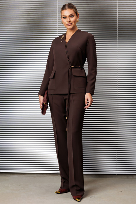 Брючный костюм, состоящий из жакета и брюк, представляет собой стильный и современный ансамбль, идеально подходящий для различных случаев. Жакет свободного кроя оснащен двубортной застежкой на потайную кнопку, что придает ему элегантный вид. Спинка выполнена со средним швом, а передняя часть украшена нагрудными вытачками и крупными накладными карманами с клапанами, добавляющими практичности. V-образный вырез горловины создает визуальный акцент, а край борта, декорированный воздушными петлями, придает жакету легкость и изящество.