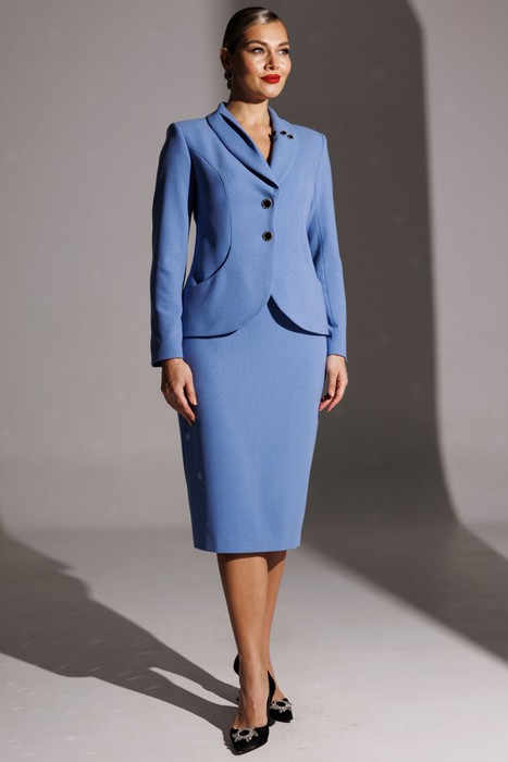 Элегантность с характером. Именно так можно описать одну из новинок от брэнда "МОДА-ЮРС". Она идеально впишется в модный гардероб и подчеркнет вашу естественную красоту. Жакет полуприлегающего силуэта с  фигурными рельефами, переходящими в карман. В жакете фантазийный воротник с декоративными элементами. Застежка центральная на петли-пуговицы. Рукав втачной, двухшовный. Спинка со средним швом и вытачками. Юбка прямая, зауженная к низу, сверху на притачном поясе. Застежка на тесьму-молнию в среднем шве, который переходит в шлицу. Костюм на подкладке.