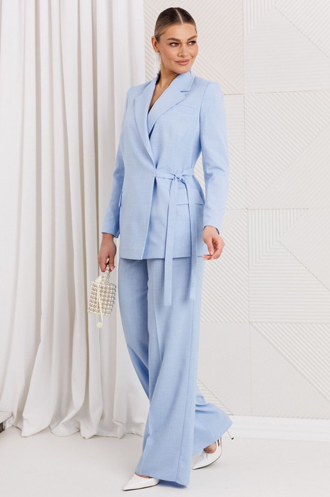Женский трендовый костюм, состоящий из жакета и брюк. Жакет полуприлегающего силуэта, удлиненный, со смещенной бортовой застежкой на завязку и потайную пуговицу. По переду талиевые вытачки, выходящие от горизонтальных подрезов, в которых обработаны карманы в рамку с клапанами. На груди обработана листочка, имитирующая нагрудной карман. Спинка со средним швом и талиевыми вытачками. Рукав втачной, двухшовный, со шлицей. На шлицах по две декоративных пуговиц. Воротник пиджачного типа. Жакет на подкладке. Брюки на притачном поясе с резинкой, прямые, со складкой по талии и с заутюженными кантами. По бокам обработаны карманы. Брюки с завышенной талией, свободной формы, выгодно подчеркивают изящность ног и придают fashion-нотку образу. Удобная в носке ткань, хорошая посадка по фигуре, универсальность и лаконичность модели не оставят равнодушной ни одну женщину