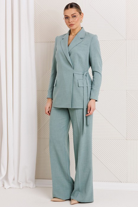 Женский трендовый костюм, состоящий из жакета и брюк. Жакет полуприлегающего силуэта, удлиненный, со смещенной бортовой застежкой на завязку и потайную пуговицу. По переду талиевые вытачки, выходящие от горизонтальных подрезов, в которых обработаны карманы в рамку с клапанами. На груди обработана листочка, имитирующая нагрудной карман. Спинка со средним швом и талиевыми вытачками. Рукав втачной, двухшовный, со шлицей. На шлицах по две декоративных пуговиц. Воротник пиджачного типа. Жакет на подкладке. Брюки на притачном поясе с резинкой, прямые, со складкой по талии и с заутюженными кантами. По бокам обработаны карманы. Брюки с завышенной талией, свободной формы, выгодно подчеркивают изящность ног и придают fashion-нотку образу. Удобная в носке ткань, хорошая посадка по фигуре, универсальность и лаконичность модели не оставят равнодушной ни одну женщину