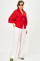 Двухпредметный комплект, состоящий из жакета и юбки. Жакет полуприлегающего силуэта, отрезной по линии талии. Перед и спинка с вертикальными рельефами, в которые вставлены рукава, сверху по окату со складками. Спинка со средним швом. Воротник пиджачного типа. Застежка на петли-пуговицы. Юбка А-силуэта, на притачном поясе, по бокам с резинками. Застежка на тесьму-молнию в среднем шве, который переходит в шлицу. Костюм на подкладке. Комплект декорирован съемной брошью в виде цветка.