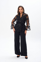 Костюм женский, состоящий из брюк и жилета. Жилет полуприлегающего силуэта с рельефами по переду и спинке, отрезной по линии талии. Низ жилета ассиметричной формы. На баске с одной стороны обработаны прорезные карманы в рамку, один из которых функциональный. Застежка двубортная на петли-пуговицы и декоративную пату. Жилет на подкладке. Брюки прямые, сверху на притачном поясе, сзади с резинкой. На передних половинках обработаны карманы. Застежка на тесьму-молнию. Данный комплект можно дополнить блузой, что позволит Вам создать разные образы.