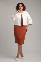 Костюм женский, состоящий из брюк и жилета. Жилет полуприлегающего силуэта с рельефами по переду и спинке, отрезной по линии талии. Низ жилета ассиметричной формы. На баске с одной стороны обработаны прорезные карманы в рамку, один из которых функциональный. Застежка двубортная на петли-пуговицы и декоративную пату. Жилет на подкладке. Брюки прямые, сверху на притачном поясе, сзади с резинкой. На передних половинках обработаны карманы. Застежка на тесьму-молнию. Данный комплект можно дополнить блузой, что позволит Вам создать разные образы.