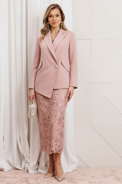 Перед вами нарядный костюм-двойка из новой весенней коллекции — идеальный выбор для деловой женщины, которая ценит строгую классику в сочетании с современным дизайном. Двухпредметный комплект состоит из жакета из костюмной ткани и элегантной юбки из гипюра. Жакет свободного силуэта с воротником пиджачного типа, с двубортной застёжкой на пару пуговиц. Спереди обработаны карманы «в рамку», нагрудные вытачки, бочки фигурной формы, переходящие в клапаны. Низа полочек ассиметричной формы, визуально вытягивающие фигуру. Спинка со средним швом и вертикальными рельефами, идущими от проймы, в которых обработаны шлицы. Рукава двухшовные, со шлицами в локтевых швах на пуговицу. Изделие на подкладке. Удлиненная юбка из о гипюра. Молния и шлица в среднем шве. Юбка на обтачке по талии, на подкладке. Зауженный крой не сковывает шаг, а длина позволяет экспериментировать с верхом - от романтичных блуз до лаконичных кроп-топов. Костюм выполнен в пыльно-розовом и вишневом цетах. Контраст фактур делает образ выразительным, статусным и идеально подходит для торжественных мероприятий, деловых встреч, офиса с дресс-кодом или светских выходов.