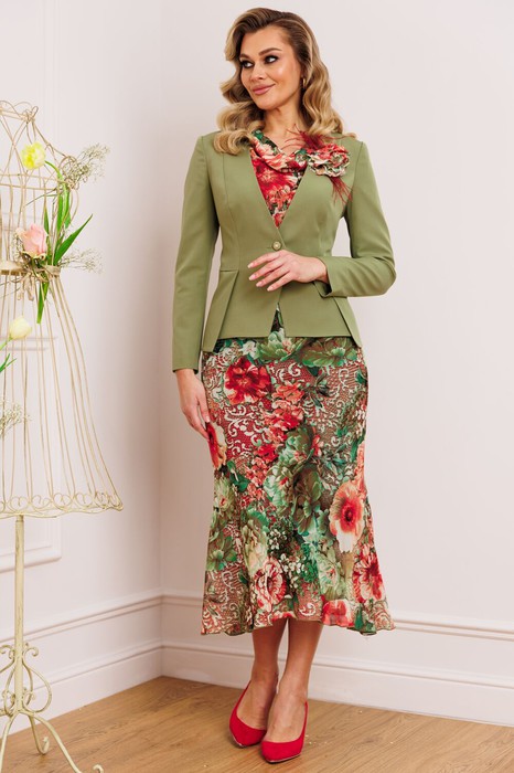 Жакет полуприлегающего силуэта, отрезной по линии талии, спереди со шлицами. Спинка с талиевыми вытачками и средним швом. Рукав втачной, двухшовный. Застежка центральная на петли-пуговицы. Жакет на подкладке.
