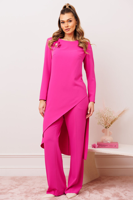 Туника полуприлегающего силуэта . Спинка со средним швом и талиевыми вытачками. По переду выполнены нагрудные вытачки, которые выходят из боковых швов. Низ туники ассиметричной формы. Вырез горловины округлой формы. Брюки прямые, слегка зауженные к колену. На притачном поясе сзади с резинкой. Брюки с карманами. Застежка на тесьму молнию. Костюм декорирован съемной брошью.