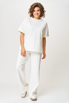 Нарядный образ с брюками из шелковистой струящейся ткани с благородным блеском. Состоит из жилета с ассиметричной застежкой. Полуприлегающий силуэт, спущенное плечо, горловина округлой формы. Карманы с клапанами. Брюки "палаццо" на притачном поясе, с двумя складками в области талии. Застежка в среднем шве. Жилет на хлопковой подкладке. В брюках резинка по талии (сзади).