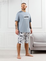 Костю мужской из трикотажного полотна "кулирка", состоящий из футболки и шорт. Футболка классического покроя, с короткими втачными рукавами и приспущенной линией плеч, горловиной овальной формы, обработанной втачной планкой и принтом на детали переда, выполненным в технике шелкографии. Нижние срезы рукавов и изделия обработаны подгибкой. По горловине настрочена отделочная строчка. Шорты длиной до колен, на притачном поясе с эластичной тесьмой внутри, с карманами в боковых швах. Нижние срезы обработаны подгибкой.