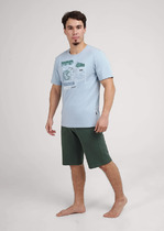 Костюм мужской, состоящий из футболки и брюк. Футболка однотонная с принтом на груди; модель свободная, со спущенной линией плеч, овальным вырезом горловины. Брюки из полотна с набивным рисунком эксклюзивного дизайна, прямые, с боковыми карманами с обтачными входами, на притачном поясе с отстроченной эластичной тесьмой.