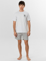 Костюм мужской из трикотажного полотна в комбинации двух видов: полотна "кулирка-кармеланж" и полотна "кулирка"с набивным тематическим рисунком на сером фоне , состоящий из футболки и брюк. Футболка - классического силуэта, свободного покроя, с приспущенным плечом, с втачными рукавами длиной до локтя, горловиной овальной формы, обработанной втачной планкой и принтом в центре переда. По шву втачивания планки настрочена декоративная (5-ниточная) отделочная строчка нитками контрастного цвета Подгибка низа рукавов и изделия так же выполнена с применением декоративной отделочной строчки. Брюки выполнены из полотна с набивным тематическим рисунком, длинные, умеренной ширины, прямые, на притачном поясе с эластичной тесьмй внутри и карманами в боковых швах.