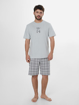 Костюм мужской, состоящий из футболки и брюк. Футболка однотонная с принтом на груди; модель свободная, со спущенной линией плеч. Брюки из полотна с набивным рисунком в узкую черно-белую полоску, прямые, с боковыми карманами с обтачными входами, на притачном поясе с отстроченной эластичной тесьмой.