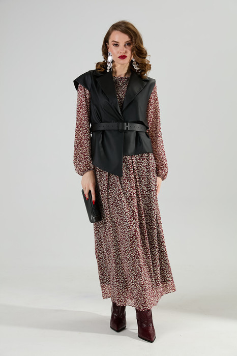 Костюм двухпредметный: состоит из платья и жилета. Платье макси прямого силуэта с V-образным вырезом, отрезное по линии талии. Горловине с имитацией чокера, застёжка на петлю и декоративную пуговицу. Рукав немного приспущен, по низу собран на манжет с петлей и пуговицей. Изделие на подкладке. Жилет из экокожи прямого силуэта с воротником пиджачного типа. По правой пройме переда расположена фигурная  деталь  "крылышко". Спинка со средним швом. По низу правого переда и низу правой спинки фигурная деталь. По левой части переда и левой части спинки отлетная кокетка. Изделие идёт в комплекте с ремнем из экокожи.