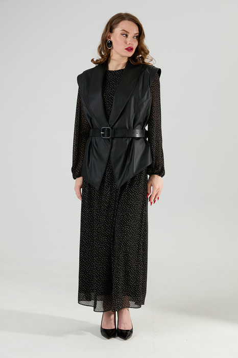 Костюм двухпредметный: состоит из платья и жилета. Платье макси прямого силуэта с округлым вырезом, отрезное по линии талии. Рукав немного приспущен, нижний край рукавов оформлен резинкой. Изделие на подкладке. Жилет удлиненный прямого свободного силуэта, воротник пиджачного типа. Линия низа по переду и спинке фигурная ассиметричная. Короткий рукав-крылышко. Талия фиксируется съемным ремнем из экокожи, для которого в боковых швах оформлены шлевки. Ремень идёт в комплекте к изделию.
