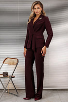 Трикотажный костюм двухпредметный: состоит из джемпера и юбки. Джемпер комбинированный свободного кроя со спущенной линией плеча. Горловина обработана воротником-стойкой с запахом. Рукава со вставкой из текстурного трикотажа "косичка". По низу рукава и изделия есть манжета. По переду изделие декорировано фигурными фалдами из основной ткани. Длина изделия 71 см. Длина рукава 58 см. Юбка-карандаш на резинке по линии талии. По боковым швам изделие декорировано трикотажной "косичкой".