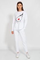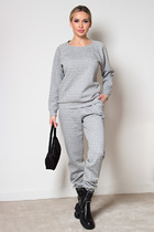 Костюм двухпредметный: состоит из жилета и юбки. Жилет полуприлегающего силуэта на подкладке. По переду вытачка, переходящая в подрез, функциональный карман. Застежка на петли-пуговицы. По спинке вытачки и хлястик. Элегантная юбка прямого силуэта длиной миди с разрезами на переднем и заднем полотнищах. Переднее полотнище с частичным запахом, имитацией боковых карманов с отрезным бочком. Заднее полотнище со средним швом, отрезной кокеткой, накладными карманами. Пояс притачной.
