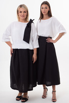 Костюм двухпредметный: состоит из блузы и юбки. Блуза прямого силуэта свободного кроя с втачным рукавом со спущенной проймой. По горловине переда планка с запахом. Воротник с цельнокроенной стойкой. По низу переда имеется нашивка из экокожи. Боковые швы с разрезами. Юбка длиной миди прямая на резинке. Разрез по переду. Изделие без подкладки.