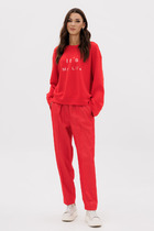 Костюм двухпредметный: состоит из жилета и брюк. Жилет из костюмной ткани полуприлегающего силуэта. Застежка центральная на петли и  пуговицы. Перед с талевыми вытачками, уходящими в линию низа. Спинка выполнена из отделочной ткани. В верхней части спинки расположена фигурная отлетная кокетка. На линии талии в боковых швах закреплен завязывающийся пояс. Брюки свободного кроя, верхний срез представлен широкой резинкой, с карманами