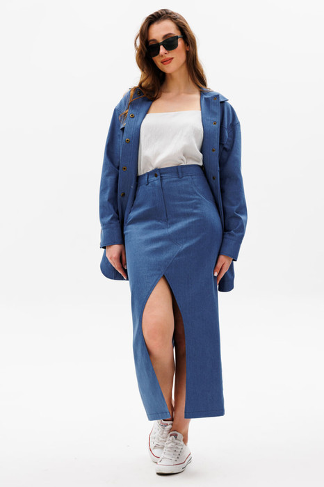 Костюм двухпредметный: состоит из рубашки и юбки. Рубашка прямого кроя со спущенной линией плеча. Горловина обработана рубашечным воротником с отрезной стойкой. Застёжка центральная на кнопки. Есть нагрудные карманы и в боковых швах. Низ рукава обработан притачной манжетой, застёгивается на кнопки. Фигурный низ. Изделие без подкладки. Элегантная юбка прямого силуэта длиной миди с разрезами на переднем и заднем полотнищах. Переднее полотнище с частичным запахом, имитацией боковых карманов с отрезным бочком. Заднее полотнище со средним швом, отрезной кокеткой, накладными карманами. Пояс притачной.