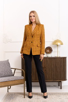 Костюм двухпредметный: состоит из жилета и брюк. Жилет назапах с полукруглым вырезом. Застёжка на петли и пуговицы на уровне плечевого шва. легантные брюки прямого кроя с боковыми карманами с отрезным бочком. Застежка на молнию и пуговицу. По переду - складки. Задние половинки с талиевыми вытачками и прорезными карманами с листочкой. Верхний срез обработан притачным поясом, по спинке на резинке.