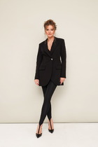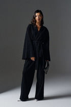 Костюм двухпредметный: состоит из жакета и юбки. Жакет прямого силуэта, воротник пиджачного типа, рукав одношовный, втачной с незначительно спущенной линией плеча, длинный, с притачной манжетой, декорированной разрезом. По линии ткани настрачная кулиса с завязками из основной ткани. Застежка центрально-бортовая. Линия низа верхней части фигурная ассиметричная. Юбка - солнце макси с узким поясом. В боковых швах расположены карманы. Застёжка на петлю и пуговицу и молнию по спинке.