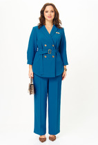 Костюм двухпредметный: состоит из жакета и брюк. Жакет прямого силуэта, воротник пиджачного типа, рукав одношовный, втачной с незначительно спущенной линией плеча, длинный, с притачной манжетой, декорированной разрезом. По линии ткани настрачная кулиса с завязками из основной ткани. Застежка центрально-бортовая. Линия низа верхней части фигурная ассиметричная. Брюки свободного кроя, верхний срез представлен широкой резинкой, с карманами.