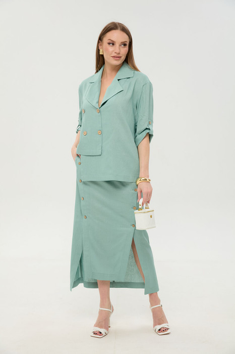 Костюм двухпредметный: состоит из жакета и юбки. Жакет прямого силуэта с имитацией центральной застёжки на пуговицы. Рукав втачной одношовный, длиной три четверти,застегивающийся на пату. Воротник пиджачного типа . Линия низа фигурная, симметричная . Юбка длиной миди, расклешенная к низу, с асимметричным низом. Пояс притачной, по спинке собран на резинку. Переднее полотнище состоит из трех частей. Правая часть скреплена отделочной строчкой и кнопками. В боковых швах изделия расположены карманы. По спинке изделия идёт средний шов и две вытачки для удачной посадки по фигуре. Юбка без подкладки.
