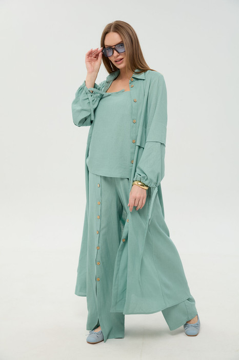 Костюм трехпредметный: состоит из кардигана-платья, брюк и топа. Платье-кардиган макси с центральной отрезной застёжкой на потайную планку на петли и пуговицы. По переду и спинке цельнокроеные складки на уровне талии. Рукав втачной, одношовный рубашечного типа. По низу рукава пробиты петли и вставлена завязка для фиксации сборки . Воротник рубашечный стояче отложной. В комплект к изделию идёт пояс из основной ткани для максимально комфортного регулирования объёма. Брюки свободного кроя, верхний срез представлен широкой резинкой, с карманами. По центру правой брючины расположена планка с функционирующими петлями и пуговицами. Топ на тонких регулируемых бретелях.