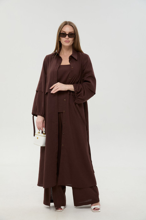 Костюм трехпредметный: состоит из кардигана-платья, брюк и топа. Платье-кардиган макси с центральной отрезной застёжкой на потайную планку на петли и пуговицы. По переду и спинке цельнокроеные складки на уровне талии. Рукав втачной, одношовный рубашечного типа. По низу рукава пробиты петли и вставлена завязка для фиксации сборки . Воротник рубашечный стояче отложной. В комплект к изделию идёт пояс из основной ткани для максимально комфортного регулирования объёма. Брюки свободного кроя, верхний срез представлен широкой резинкой, с карманами. По центру правой брючины расположена планка с функционирующими петлями и пуговицами. Топ на тонких регулируемых бретелях.