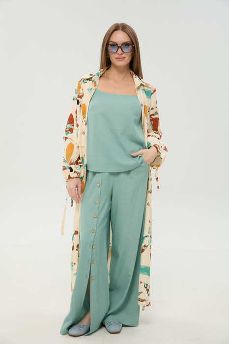 Костюм трехпредметный: состоит из кардигана-платья, брюк и топа. Платье-кардиган макси с центральной отрезной застёжкой на потайную планку на петли и пуговицы. По переду и спинке цельнокроеные складки на уровне талии. Рукав втачной, одношовный рубашечного типа. По низу рукава пробиты петли и вставлена завязка для фиксации сборки . Воротник рубашечный стояче отложной. В комплект к изделию идёт пояс из основной ткани для максимально комфортного регулирования объёма. Брюки свободного кроя, верхний срез представлен широкой резинкой, с карманами. По центру правой брючины расположена планка с функционирующими петлями и пуговицами. Топ на тонких регулируемых бретелях.