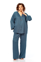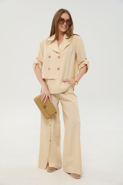 Костюм двухпредметный: состоит из жакета и брюк. Жакет прямого силуэта с имитацией центральной застёжки на пуговицы. Рукав втачной одношовный, длиной три четверти,застегивающийся на пату. Воротник пиджачного типа . Линия низа фигурная, симметричная . Брюки свободного кроя, верхний срез представлен широкой резинкой, с карманами. По центру правой брючины расположена планка с функционирующими петлями и пуговицами.