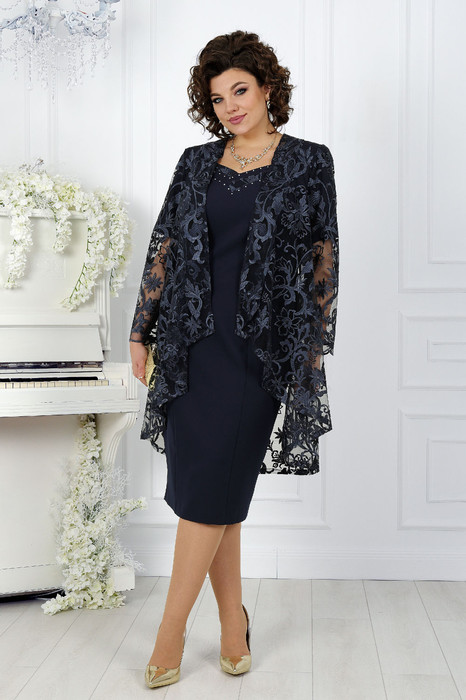 Платье женское полуприлегающего силуэта, длиной по среднему шву спинки р 52,54,56,58,60 - 104 см; р.62,64,66 - 105,5 см. Перед с рельефными швами, проходящими через центр груди, идущими от пройм до низа. Центральная часть переда в области горловины с фигурными подрезами, декорированы кружевом и стразами. Спинка с рельефными швами, идущими от пройм до низа, со средним швом, в верхней части которого расположена застежка на потайную тесьму-"молнию", в нижней – шлица. Горловина спинки округлой формы, переда – фигурное каре, декорирована стразами. Рукав втачной, одношовный, длиной 27 см.