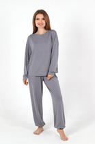 Комплект брючный 2-х предметный, состоящий из блузки и брюк. Блузка полуприлегающего силуэта, выполнена из вискозного полотна. Модель с плечевыми накладками и разрезами в боковых швах. Перед декорирован вставками с застроченными вертикальными защипами и отрезными фигурными планками, застегивающимися на 3 петли и 3 пуговицы. От планок к швам притачивания вставок направлены навесные петли, застегнутые на пуговицы. Спинка со средним швом; круглая горловина спинки обработана отрезной фигурной бейкой. Рукав короткий, втачной. Длина блузки – 66,5 (46-50 р-р) см, 69 см (52-60 р-р); длина рукава – 19,5 см (46-50 р-р), 20,0 (52-60 р-р) см. Брюки классические, с посадкой на талии, выполнены из вискозного полотна. Модель с центральной застёжкой на тесьму-«молнию», на притачном поясе, застегивающемся на петлю и пуговицу. Передние и задние половинки брюк с талиевыми вытачками, направленными от пояса вниз. Спереди обработаны боковые наклонные карманы. Для лучшего прилегания брюк в области талии в поясе по задним половинкам вставлена эластичная лента. Длина брюк по боковому (с поясом) – 101,5 см (46-50 р-р), 102,5 см (52-54 р-р), 103,5 см (56-60 р-р).