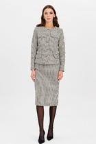 Комплект женский, состоящий из жакета и платья. Укороченный жакет полуприлегающего силуэта на подкладке. Деталь переда с двумя талевыми вытачками и с фигурным подрезом около горловины. Спинка со средним швом и рельефами, выходящими из проймы вниз. Рукава втачные, двухшовные, длиной 48,0 см., с разрезом по локтевому шву. Горловина углубленная, круглая, обтачная. Борта круглые, застежка на навесную петлю-пуговицу. Изделие с плечевыми накладками. Платье полуприлегающего силуэта, отрезное по линии талии. На детали переда рельефы выходят из проймы, проходят через центр груди вниз.  Спинка цельнокроеная, с талевыми выточками. Юбка широкая к низу, с тремя клиньями спереди и сзади.  Посередине каждого клина зашиты встречные складки. В левом боковом шве обработана застежка на потайную тесьму молнию. Рукава втачные, одношовные. Горловина углубленная, обтачная, с вырезом в виде “капельки” посредине переда. Углы выреза скреплены украшением. Пояс отлетной, обтачной, из двух цветов ткани, с перекантом на лицо и с застежкой на петлю-пуговицу сзади.  Изделие с плечевыми накладками.