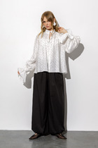 Брюки классические длинные, прямого силуэта, с посадкой на талии, выполнены из трикотажного полотна «велюр». Модель с центральной застёжкой на тесьму-«молнию», на притачном поясе, застегивающемся на петлю и пуговицу. Передние и задние половинки брюк с талиевыми вытачками, направленными от пояса вниз. Спереди обработаны боковые наклонные карманы. Для лучшего прилегания брюк в области талии в поясе по задним половинкам вставлена эластичная лента. Длина брюк по боковому (с поясом)-107 см (52-54 р-р), 108 см (56-60 р-р).