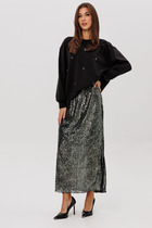 Блузка А-образного силуэта, выполнена из шифона и гипюра. Модель без подкладки и застежки, с плечевыми накладками. Низ блузки асимметричной формы: укороченный спереди и удлиненный к центру спинки. Перед и спинка состоят из двух разных по длине слоев. Перед с нагрудными вытачками, направленными от пройм. Спинка с притачной кокеткой и вставкой из гипюра, входящей в боковые швы и шов кокетки; верхний двойной шифоновый слой состоит из двух частей, скрепленных по шву кокетки на запах. Горловина круглой формы, спереди углубленная, обработана узкой косой бейкой. Рукав короткий, расширенный, состоит из двух разных по длине слоев; передняя и задняя часть рукава скреплены по окату на запах и расходятся к низу A-образным разрезом. Длина блузки (спинка) – 92 см, длина блузки (перед) – 66 см. Длина рукава – 42 см.