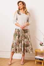 Блузка полуприлегающего силуэта, выполнена из трикотажного полотна «масло». Модель без плечевых накладок. Перед с горизонтальным подрезом выше линии груди: нижняя часть -- с нагрудными вытачками, верхняя -- выполнена в виде имитации банта с перемычкой. Рукав короткий, втачной. Длина блузки-57 см; длина рукава 23 см.