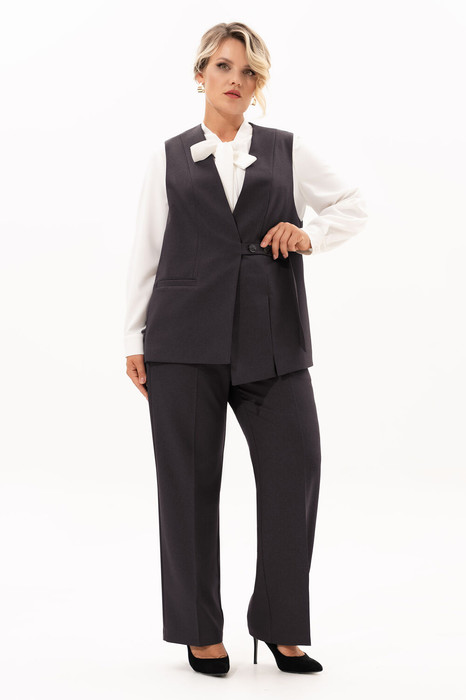 Костюм женский классический это идеальное решение для Вашего гардероба. Комплект  состоит из двух предметов - прямые брюки с высокой посадкой прямого кроя на молнии и на резинке, с боковыми карманами сочетаются  с любыми базовыми вещами. Универсальный классический жилет с V-образным  вырезом горловины превосходно садится по фигуре, на правой полочке обработан прорезной карман с листочкой, на левой разрез , застежка обработана  на отлетном хлястике ,на петлю и пуговицу.  Этот элемент делает  его более интересным. Жилет на подкладке . Ассиметричный жилет можно одевать поверх тонкой одежды. Базовый брючный костюм идеален для повседневного образа на работу в офис,школу, а при нарядной блузке  комплект превращается  в нарядный.  Современный  костюм  также будет хорошо смотреться как вечерний наряд на различные мероприятия, праздники, день рождения, корпоратив. Шикарный нарядный станет незаменимым в Вашем гардеробе . Этот костюм  подчеркнет Вашу уверенность и стиль.