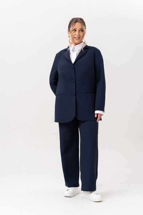 Легкий, утончённый и одновременно уверенный — этот женский брючный костюм создан для тех, кто ценит в образе и комфорт, и поэтичность линий. Прямой жакет мягко обнимает фигуру, не сковывая движений. Его высокая однобортная застёжка на три пуговицы словно намекает на строгость, но закруглённые борта полочек придают силуэту мягкость и женственность. Аккуратные бочки на передней и задней частях создают деликатную форму, а линия спинки со средним швом подчёркивает изящество посадки. Вытачка, направленная от кармана к центру груди, едва заметно формирует прилегание, будто костюм подстраивается под свою хозяйку — легко, нежно и без давления. Карман в листочку сохраняет элегантность, не отвлекая от общего впечатления. Брюки поддерживают общий характер комплекта — лаконичные, прямые, с комфортным поясом на резинке, дополненным имитацией гульфика. Это та самая вещь, которую хочется надеть утром и не снимать весь день. Она не требует усилий, но создаёт ощущение завершённости и внутренней гармонии.