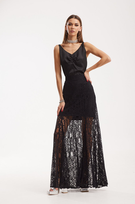 Юбка по силуэтной форме – годе от уровня колена. Выполнена из кружевного полотна. Юбка на подкладке длиной мини, длина самой юбки – макси. Верхний срез обработан поясом. Юбка состоит из центральных и боковых частей переда и спинки, клиньев, вставленных в рельефы по переду и по спинке. На заднем полотнище расположен  средний шов с застежкой на молнию.