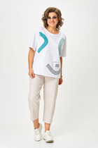 Брюки расширенного силуэта, со стрелками, с притачным поясом, застегивающимся на одну пуговицу. На поясе расположены шлевки. Застежка брюк с гульфиком на "тесьму-молнию". Брюки с наклонными карманами к боковому шву. Передняя половина брюк с одной направленной складкой. На задних половинах брюк расположены талевые вытачки.