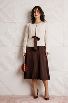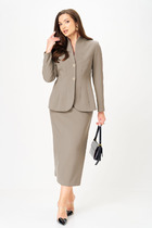 Комплект женский состоит из жакета и брюк. Жакет выполнен из костюмной ткани в полоску, а брюки – из светлой, однотонной ткани.