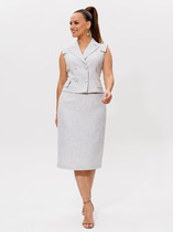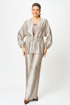 Комплект повседневный, состоит из жакета, блузки и брюк. Жакет полуприлегающего силуэта без застежки, с закругленными бортами. Перед с нагрудными вытачками, горизонтальный подрез ниже талии, в котором расположены функциональные карманы. Вдоль борта отрезная планка, переходящая воротник-стойку. Декоратиные украшения под золото. Спинка со средним швом. Рукав двухшовный с притачной манжетой. Перед и спинка на подкладке. Брюки заужены к низу, на поясе, частично на резинке. Карманы в боковых швах. По переду и спинке заутюжены стрелки. Блузка с округлым вырезом горловины, со спущенной линией плеча.
